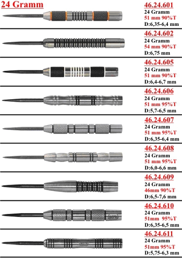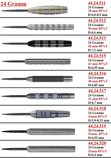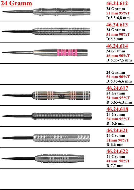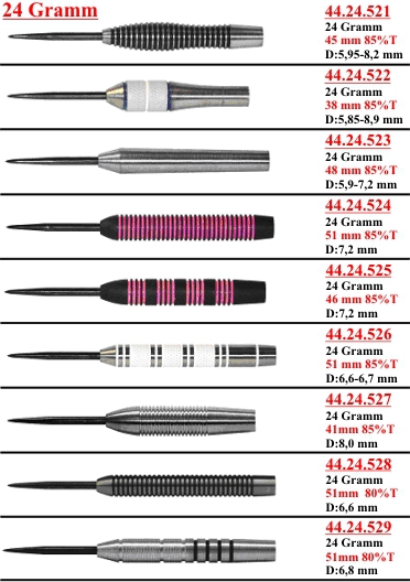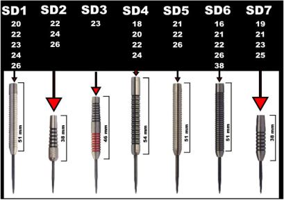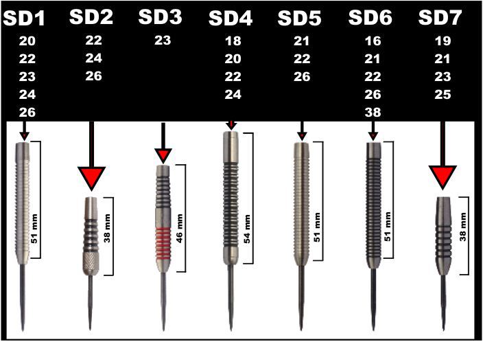 und die Grammzahl (z.B. SD2 24 Gramm). Achtung die angegebenen Grammzahlen sind netto, d.h. ohne Schaft, Ring und Flight. Geliefert werden die Darts mit Schäften, Ringen und 3 Flights.