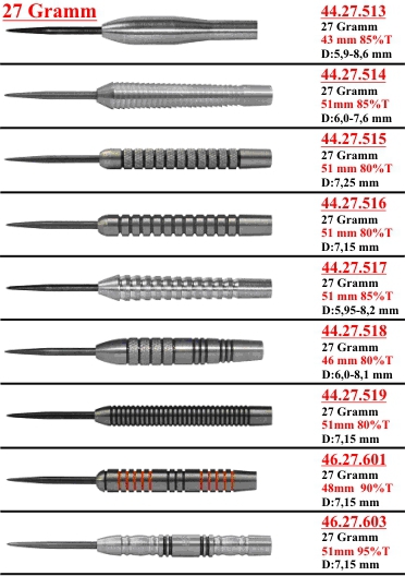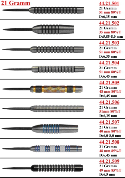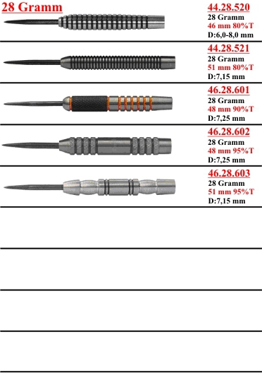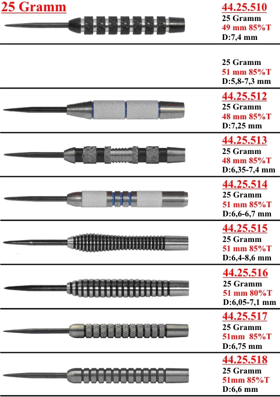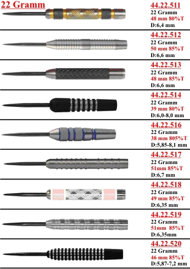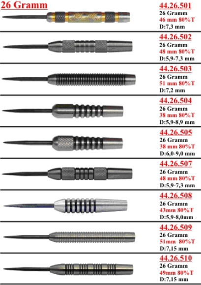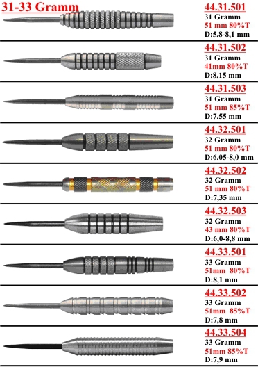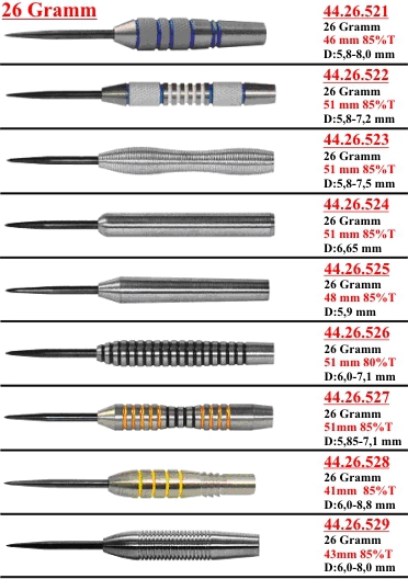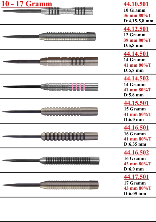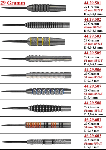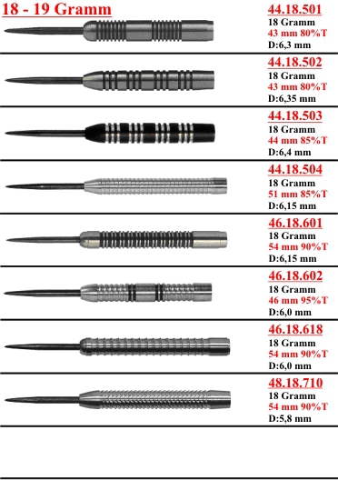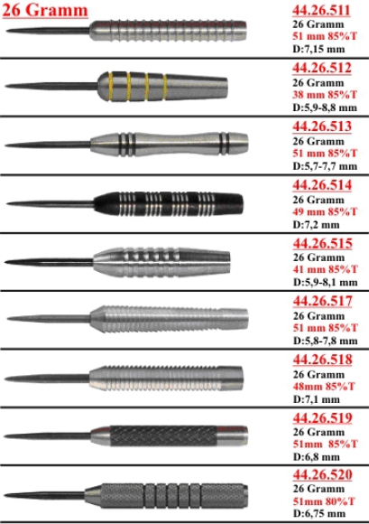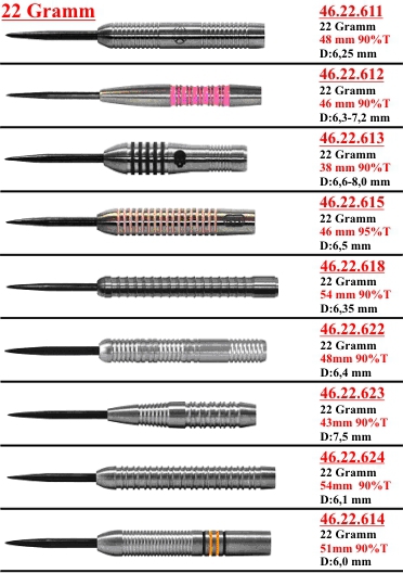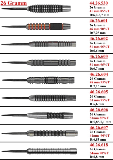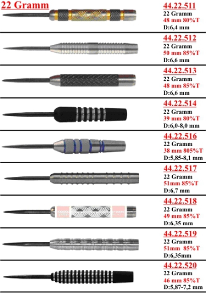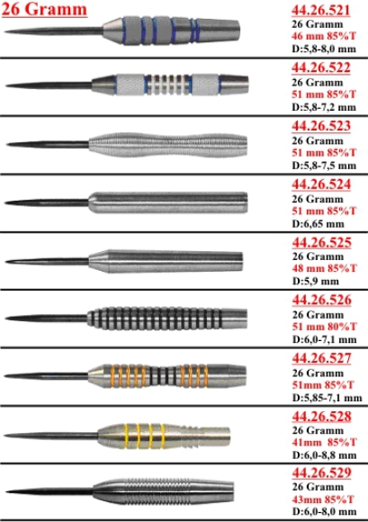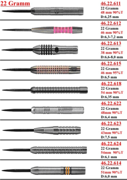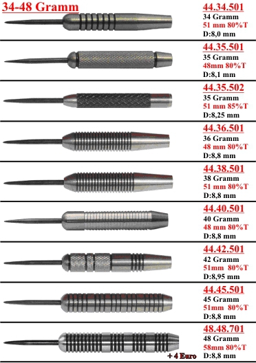 Hier jetzt eine riesige Auswahl an Steeldarts nach Gramm sortiert. 10 - 48 Gramm.